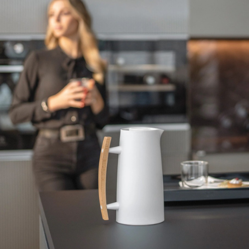 Elegantni termo bokal kapaciteta 1 litre iz Guzzini-kolekcije „Riviera ’63“ spaja kultni dizajn i vrhunsku funkcionalnost: vakuumska izolacija – napitci ostaju topli do 12 h ili hladni do 24 h, ručka od prirodnog drveta, široko grlo za lako sipanje i nepropusni poklopac „klik“ mehanizmom. Idealno za domaćinstvo, kancelariju ili poklon sa stilom.