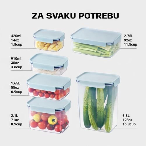 Pravougaone: 385ml (13.8 x 9.9 x 6.7 cm), 420ml (16.7 x 11.6 x 5.3 cm), 910ml (19.3 x 14.1 x 6.7 cm), 1,65l ( 22.1 x 17 x 8.4 cm), 2l (19.3 x 14.1 x 12.9 cm), 2,75l (24.7 x 19.5 x 9.9 cm), 2,8l (27.8 x 19.7 x 8.8 cm), 4l (19.3 x 14.1 x 25.1 cm), 4,4l (27.8 x 19.7 x 12.8 cm), 6l (27.8 x 19.7 x 17 cm)