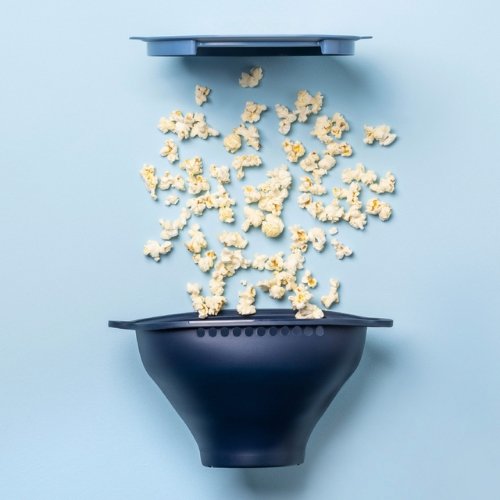 Posebna posuda od borosilikatnog stakla u kombinaciji sa silikonskim delovima obezbeđuje ravnomerno zagrevanje zrna kukuruza i efikasno pucanje. Tokom pripreme, poklopac se drži u otvorenom položaju kako bi vlaga mogla da izađe. Nakon završetka, poklopac se može okrenuti i zatvoriti, čime se omogućava ravnomerno mešanje začina sa kokicama bez prosipanja.